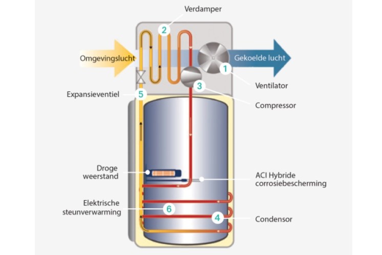 De ventilator (1) zuigt omgevingslucht aan. De warmte uit deze aangezogen lucht wordt afgegeven aan het koelgas (2). Dit gas wordt samengedrukt in de compressor (3) waardoor het verder opwarmt en vloeibaar wordt. In de condensor (4), geeft deze vloeistof zijn warmte af aan het water in het reservoir. Als de vloeistof afgekoeld is passeert deze het expansieventiel (5) en verandert weer in gas. De elektrische steunverwarming (6) wordt enkel geactiveerd als de warmtepomp niet aan de vraag kan voldoen.